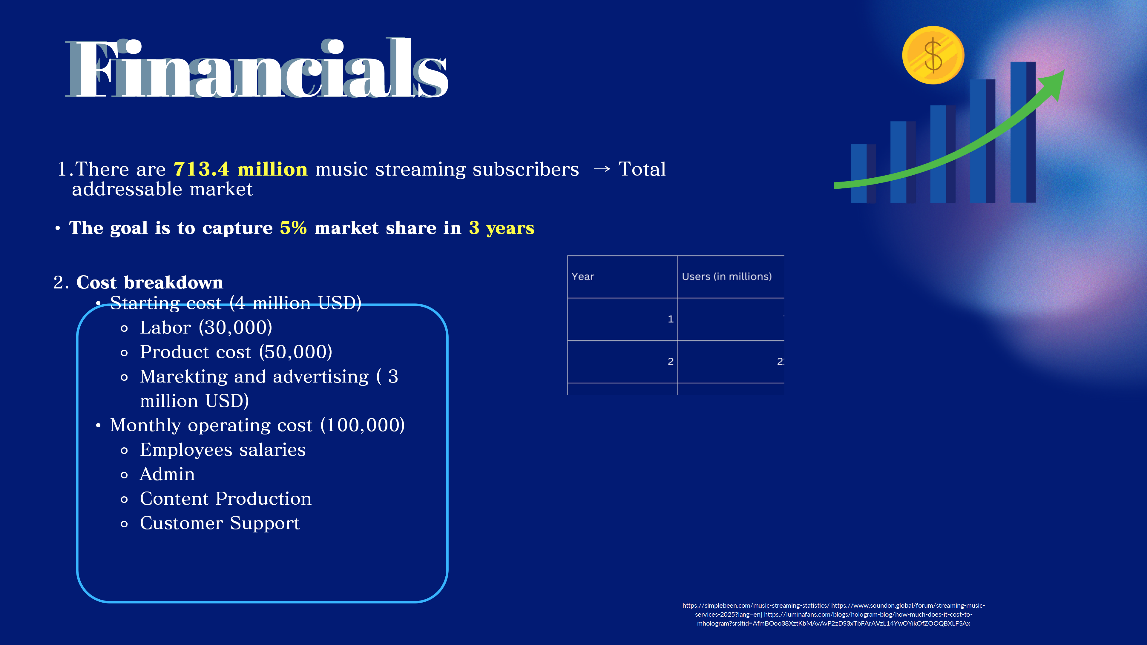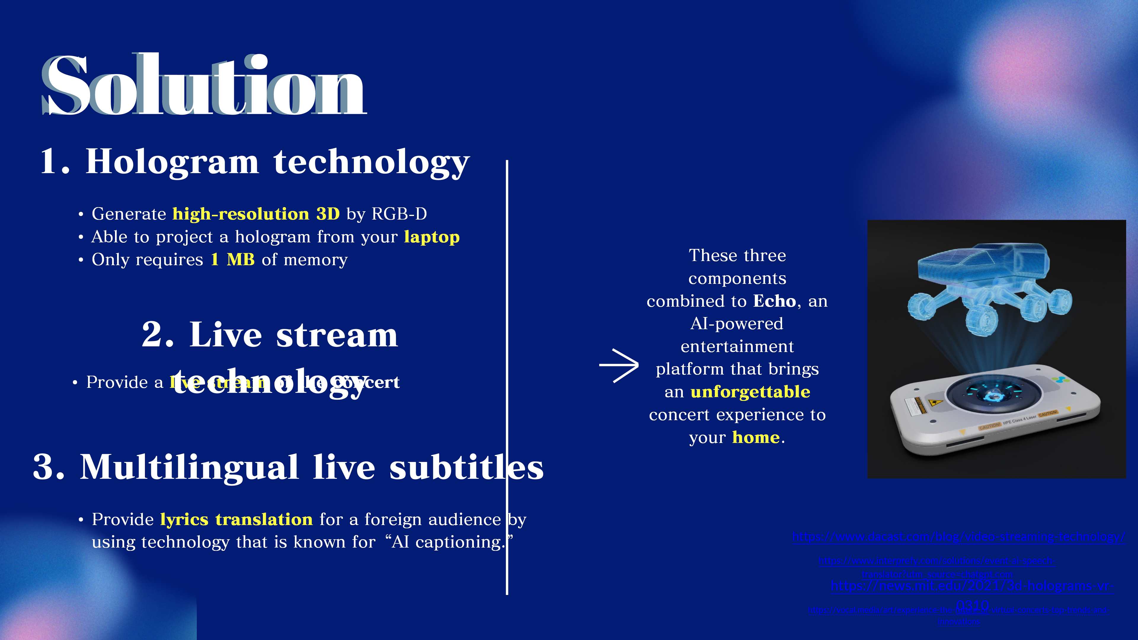你的商业计划应该是高度可行的、有研究支持的、切合实际的策略,并且要清晰地展示此商业计划将如何带领你的公司走向成功。展示你的创造力,让观众相信你有在行业或者市场上具有强大的潜力,能够开拓新的发展。